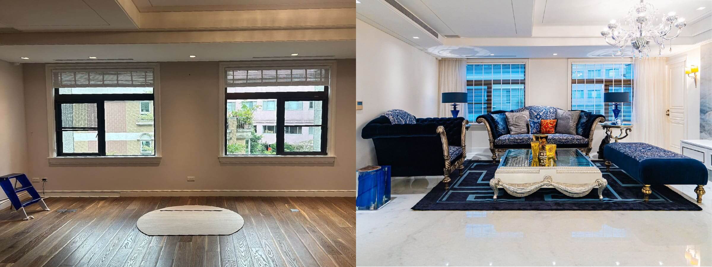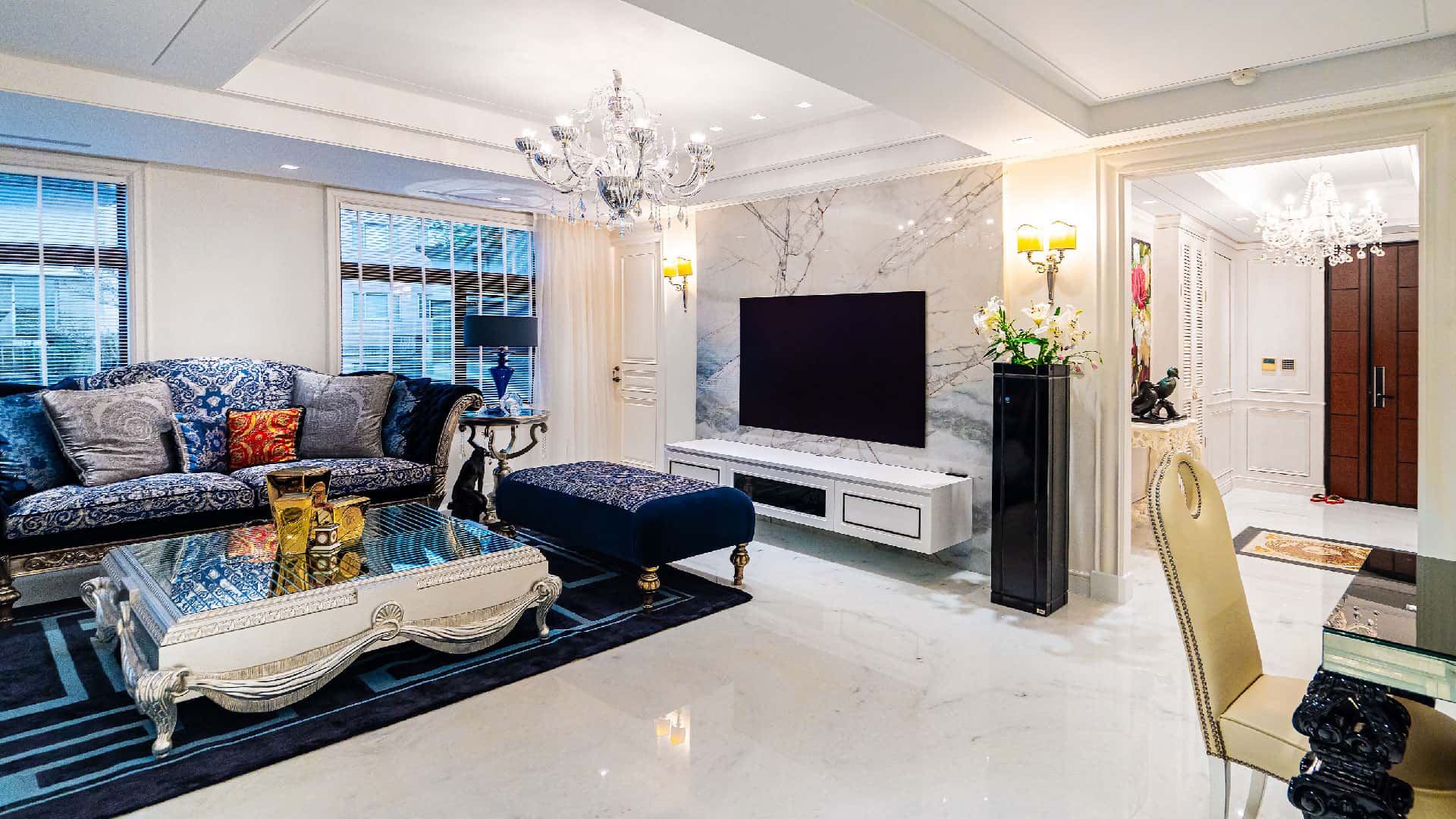 本案屋主為國際紡織產業企業主,同時也是Versace Home家具的長期收藏者,對於空間細節與材料選擇有相當明確的想法。這次購置的住宅為二手屋,在進行舊屋翻新時,設計團隊必須考慮如何保留原有家具、燈飾與裝飾收藏,同時讓整體空間符合現代住宅的生活需求。透過重新調整格局比例與動線,讓來自舊住宅的家具能夠在新的場域中找到合適的位置,也讓整體 信義區室內設計 呈現出更流暢的空間節奏。