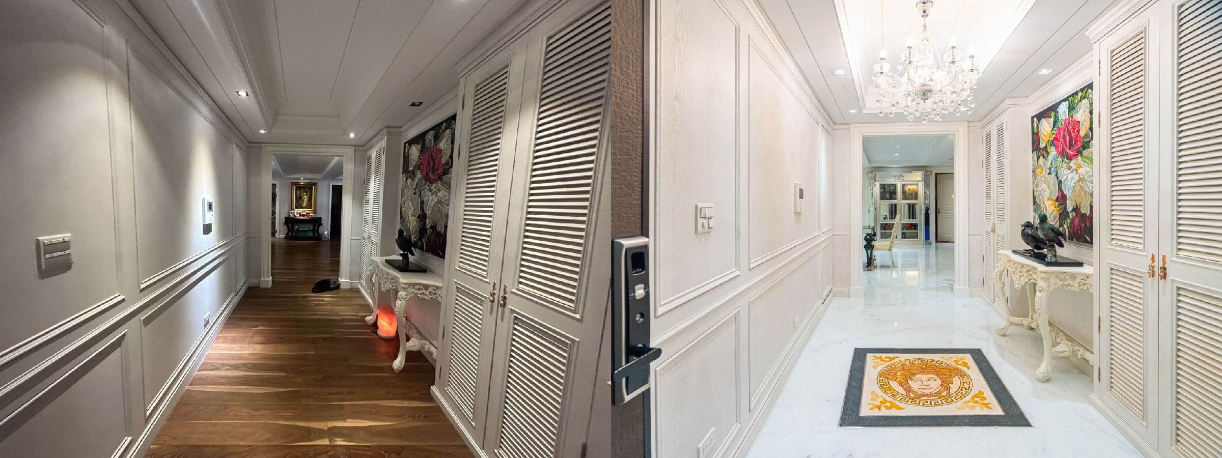 在家飾配置方面,空間中保留並重新安排了多件Versace家飾收藏,包括桌飾、餐具與裝飾盤等物件。這些細節讓住宅空間不只是單純的室內設計案例,更像是屋主長年生活與收藏的一部分。透過家飾的加入,整體空間在家具之外多了一些生活溫度,也讓整體豪宅設計更加完整。