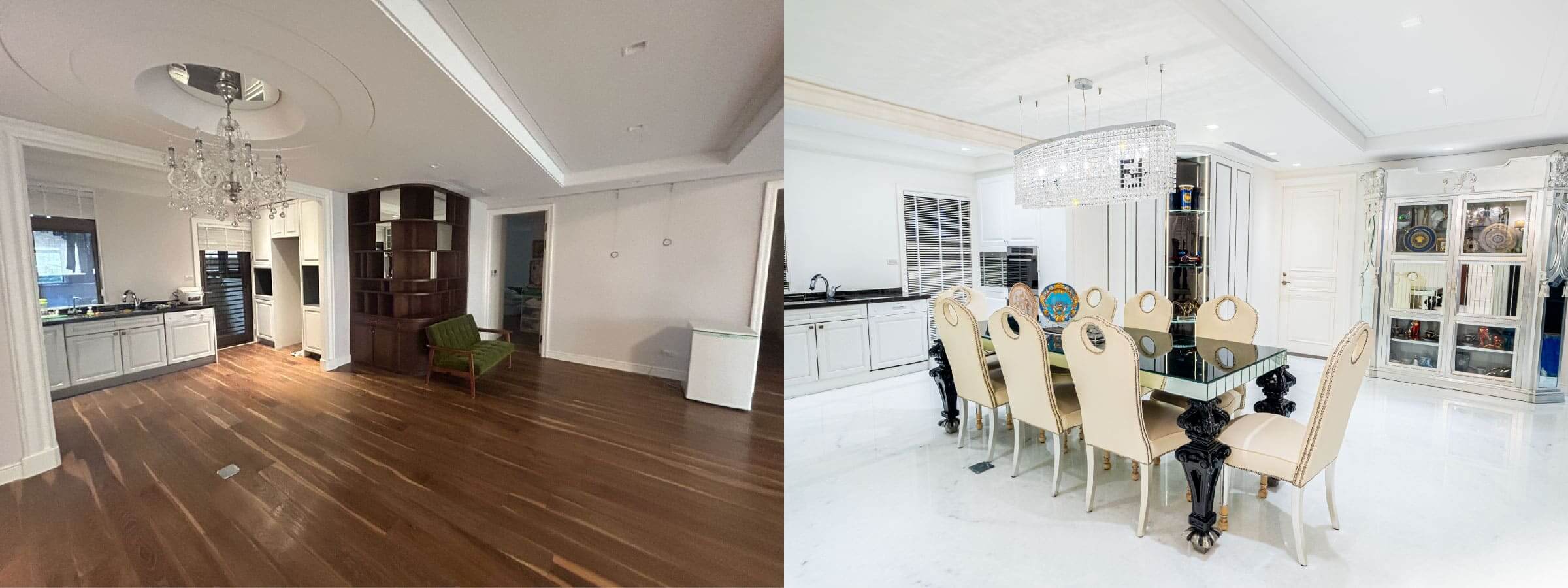 餐廳區域則延續整體家具配置,搭配Cornelio Cappellini餐椅與水晶吊燈。餐椅線條細緻,椅背雕刻與座墊比例設計,使整體餐廳呈現出較為典雅的氣氛。餐桌與餐椅的色彩配置與客廳保持一致,使整個公共空間在視覺上形成連續的場景,也讓 義大利進口家具 在整體住宅設計中扮演重要角色。