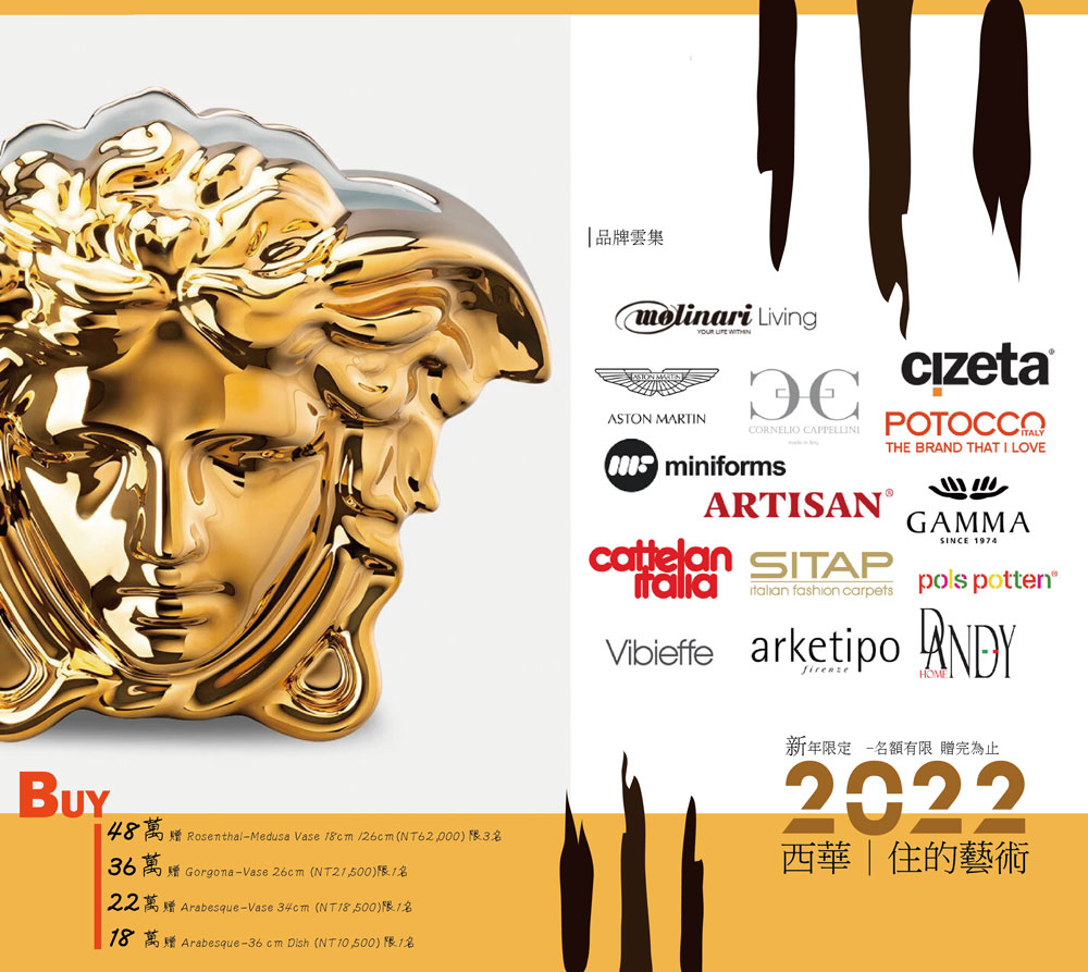 歡度虎年 添旺買氣,集家具界各大狂熱品牌 西華住的藝術 總代理 從家飾到家具,凡消費滿18~48萬起,滿額再贈Versace花瓶或水晶盤,名額有限 贈完為止。
