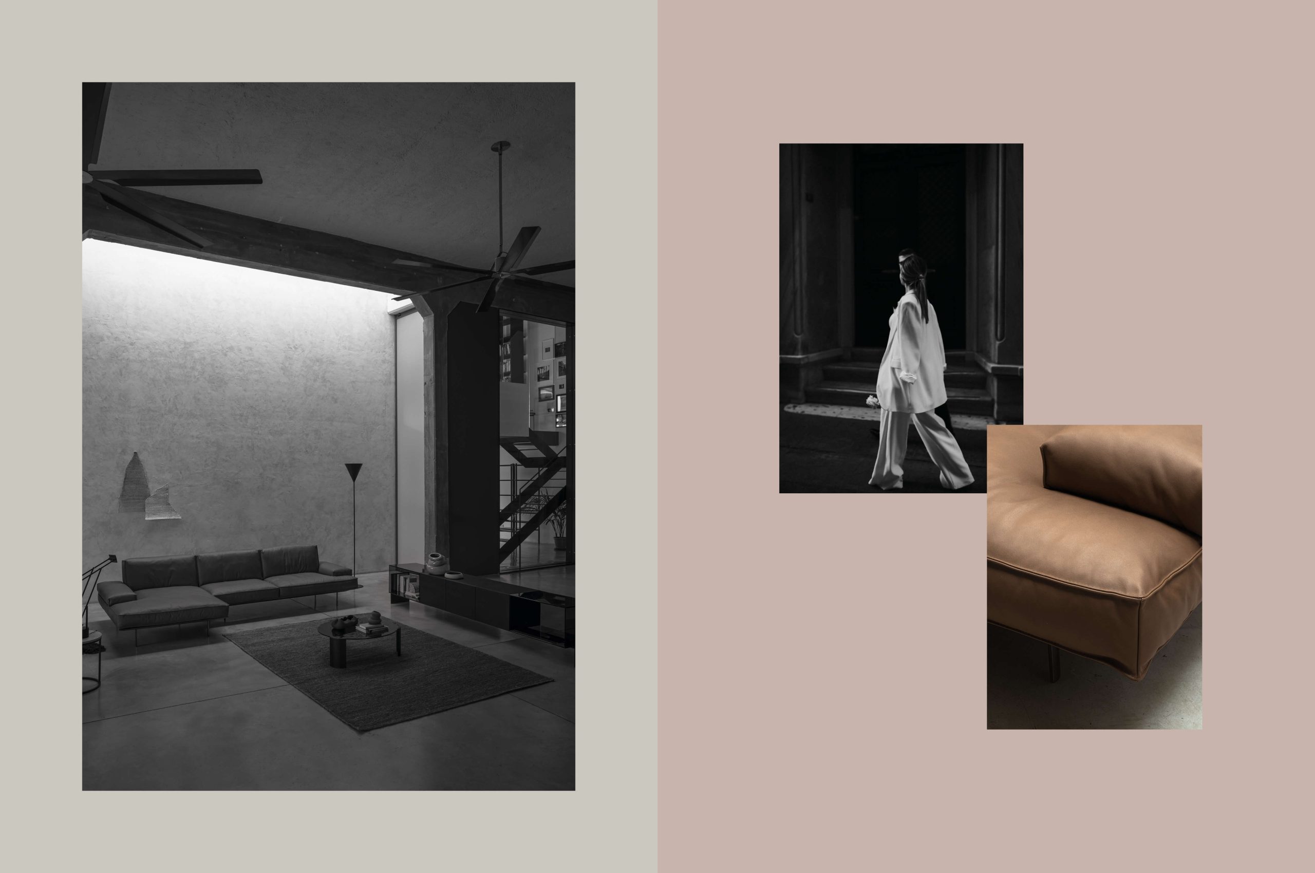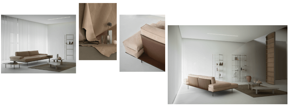 Vogue 被形容為「身體與空間的建築」,其設計語彙結合了六〇年代理性幾何線條,與東方文化中對大面積休憩空間的理解。方正的模組構成,如同一座可被組裝的內凹式客廳結構,使沙發不只是單一座位,而更像一處被界定出的靜謐區域。模組之間的直線與皮革原切邊所呈現的粗獷質感形成對比,讓視覺在理性與自然之間取得平衡。