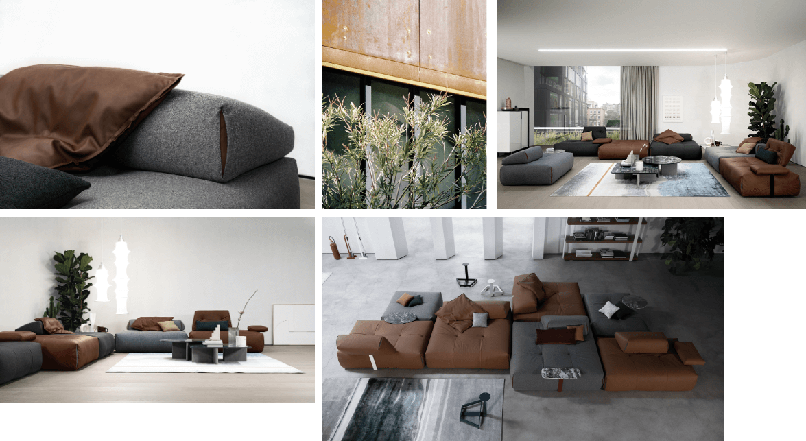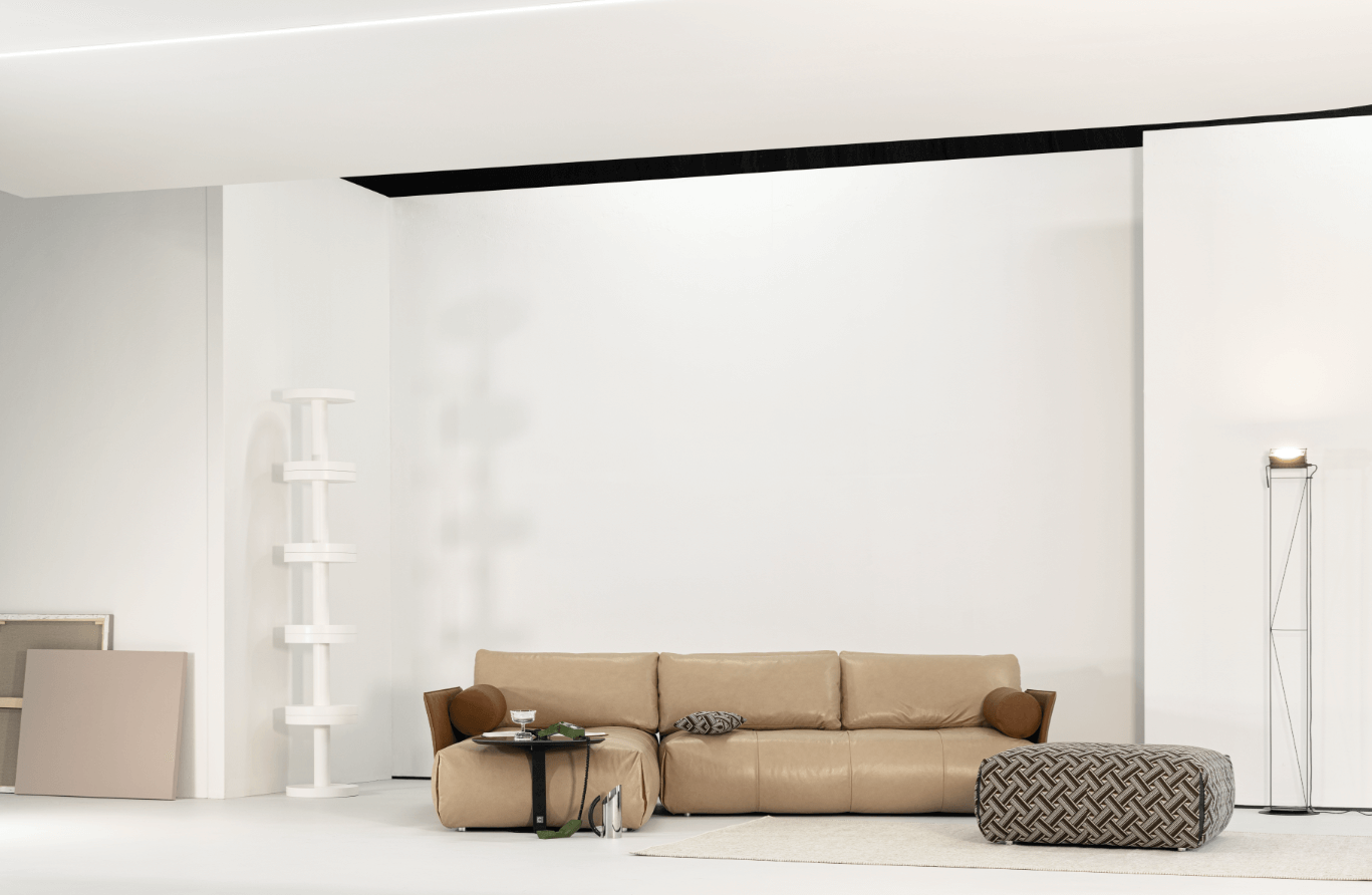 Tab 2022 將設計焦點轉向材質層次的平衡關係。皮革的溫潤與織物的柔軟,被安排在不對稱輪廓中,外框維持線性結構,內部則以較圓潤的形體回應坐感。搭配鍍鉻結構的陶瓷邊几後,比例被輕輕提亮,形成材質之間的對話。整體不以裝飾取勝,而是透過色彩與細節的節制,呈現屬於當代的沉穩氣質。