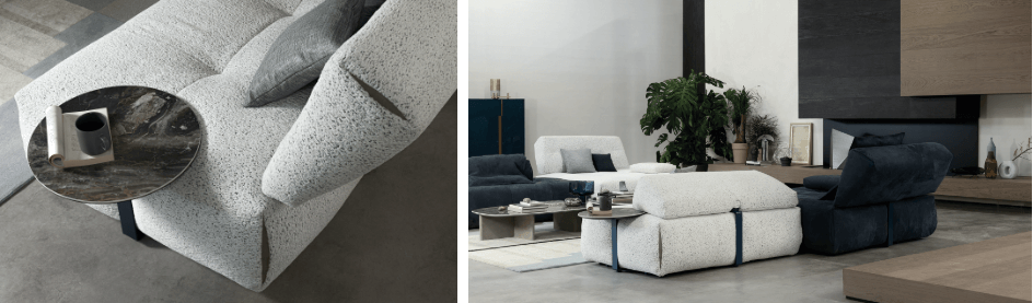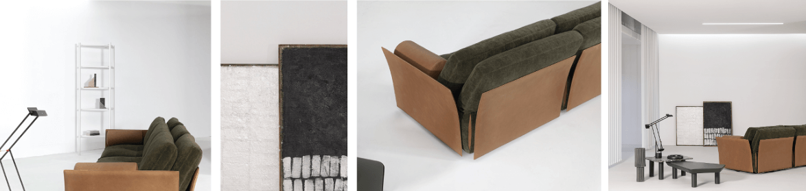 相較於 Vogue 的建築感,Tab 更像是一種關於彈性配置的提案。線性輪廓與柔軟比例共存,帶有七〇年代風格的回聲,卻不受限於固定幾何形式。其模組可被拆解、延伸或鏡像組合,依空間條件調整比例,背靠、扶手與邊几則可透過金屬結構固定於沙發側邊,使整體視覺保持完整。這樣的設計邏輯,使 Tab 不只是單一造型沙發,而是一組可隨生活狀態調整的座位系統。