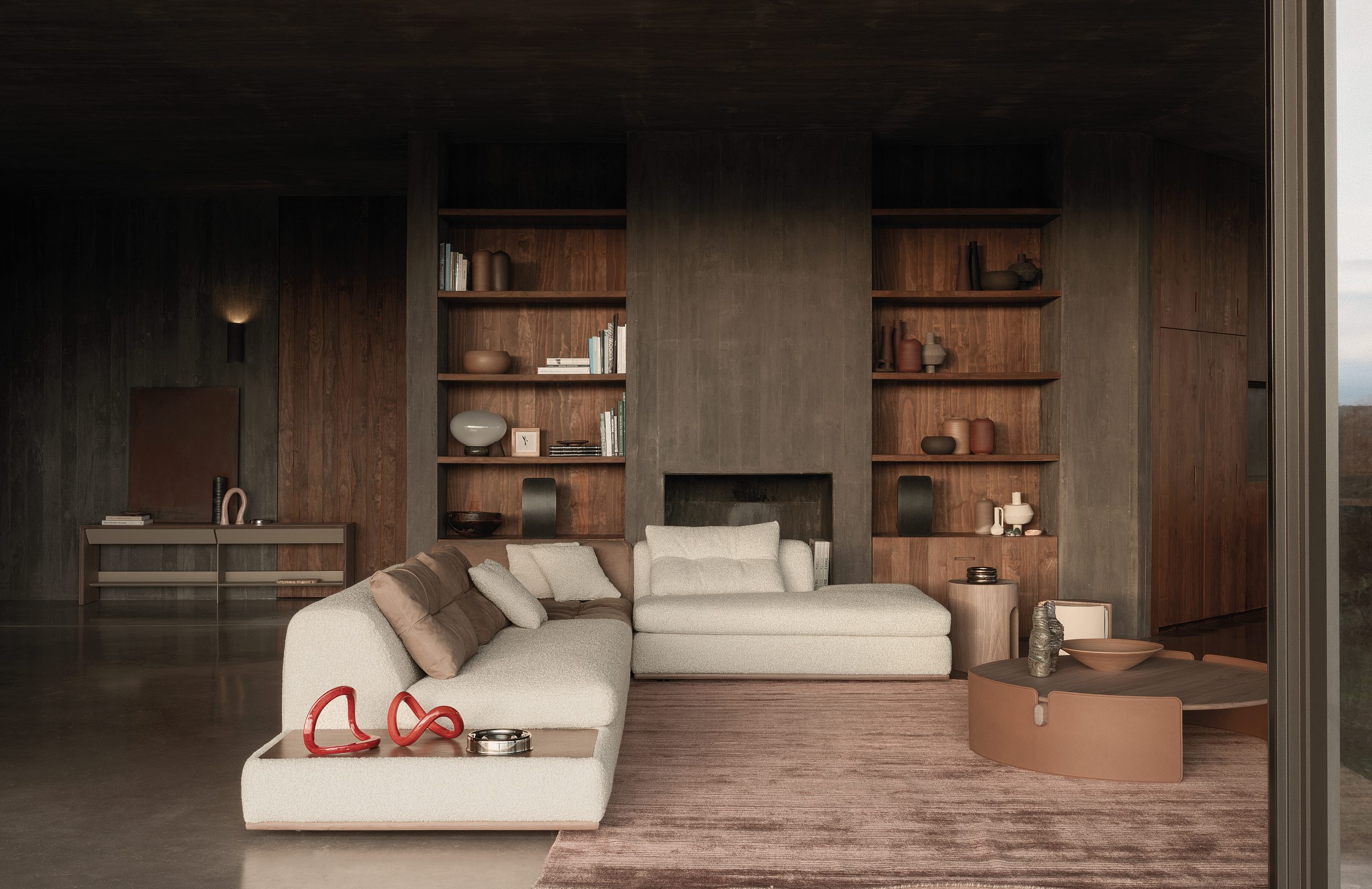 Boogie Sectional 以 BV 編織同款設計 為核心語彙:手工交織的皮革面板沿著扶手與側板延展,將義式沙發的圓潤量體,雕塑出具有層次的光影肌理。這種細節不只是一種裝飾,而是讓材質被看見、被觸摸的方式——近看能讀到每一道纖維的張力,遠看則形成俐落而精緻的輪廓。內部以高密度記憶泡棉與羽絨混填建立坐感基礎,外層可選 全苯染牛皮 或 絲感織品;當皮革與編織相遇,Boogie 同時擁有溫潤與鮮明的存在感。模組化配置支援直線、L 形與轉角島型,從都會單面牆到大尺度開放空間,都能以編織面為視覺焦點,完成一眼辨識的場域標記。這不是誇飾的豪華,而是用工藝把「經典」落在日常裡的方式。