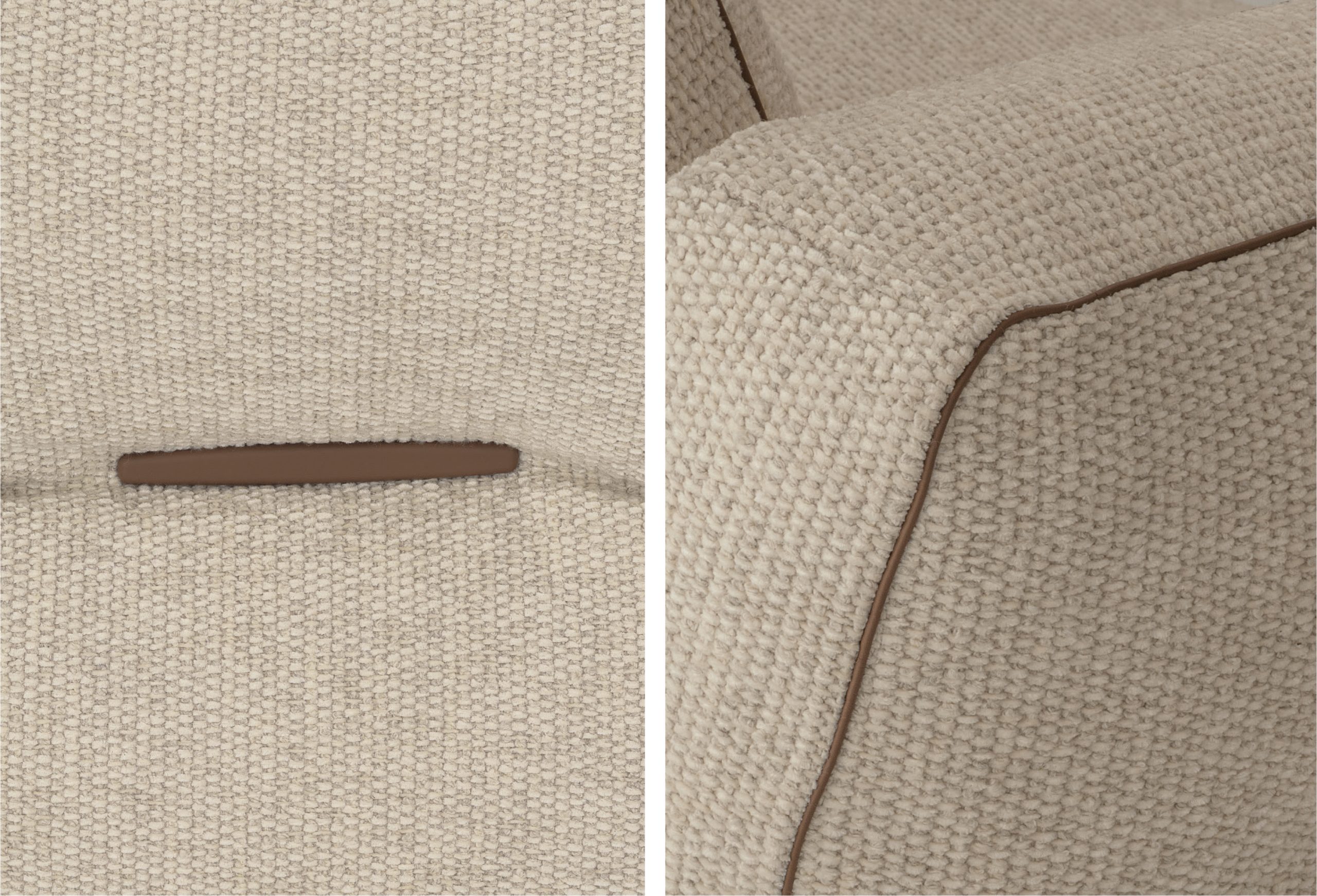 LEONARDO 與 LEONARDO MINI 將模組沙發從「直線與平面」解放,導入連續的弧度與向後微傾的座深——前端水平、後端緩降,坐面自然銜接背靠與扶手,形成如同 chaise longue 般的放鬆姿態。以明晰的滾邊(piped seams)與精準等深絎縫描出輪廓,讓每個模組在視覺上被統一為一個有力而完整的形體;幾何與人體比例的交會,隱約致敬達文西《維特魯威人》的和諧秩序。