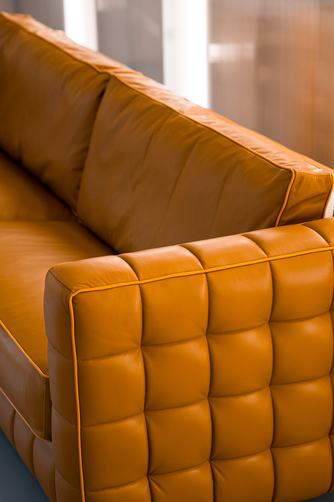 其採用 半苯染 處理,皮革表面極具深度光澤與自然色澤變化,亦使每張 Josef 沙發都擁有獨一無二的肌理。最特別的是,這款限量版的重點在於靠墊導入了 馬鞍皮 包覆與 布料 拼接設計 ,讓剛與柔、冷與暖、皮與布交織出更具現代層次感的視覺層次,也更貼近 現代住宅 對材質混搭的渴望。