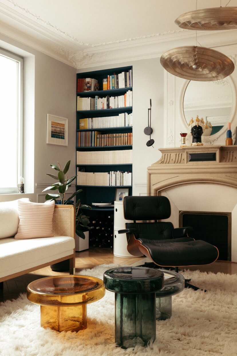 白天,陽光穿過玻璃,在地面形成流動的光影;晚上,燈光映照出琥珀般的色澤。它不是配角,而是讓客廳開始有表情的存在。