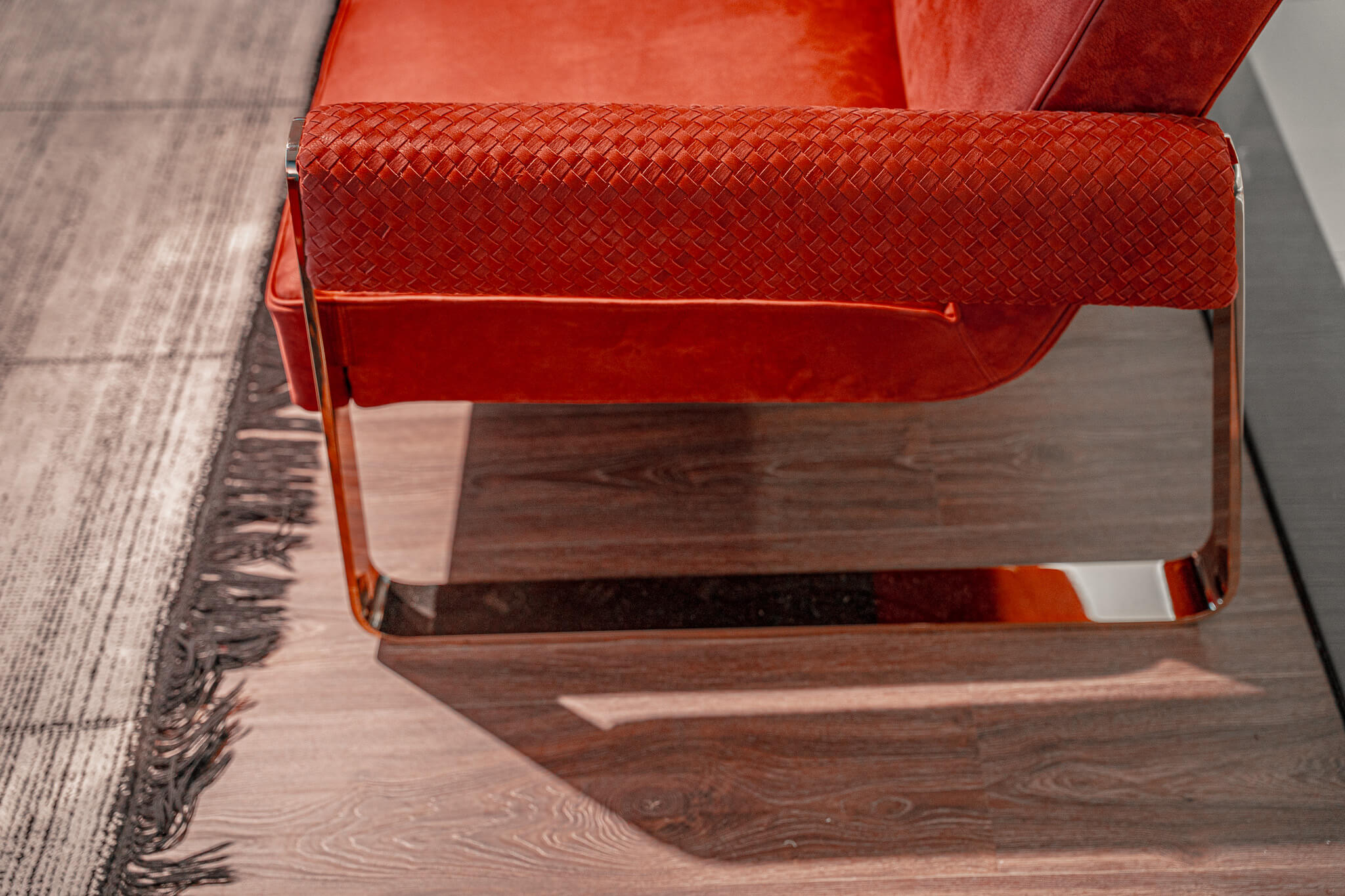 A:這款單椅風格沉穩,可與石材、木質、金屬、BV 風格收納櫃等搭配。