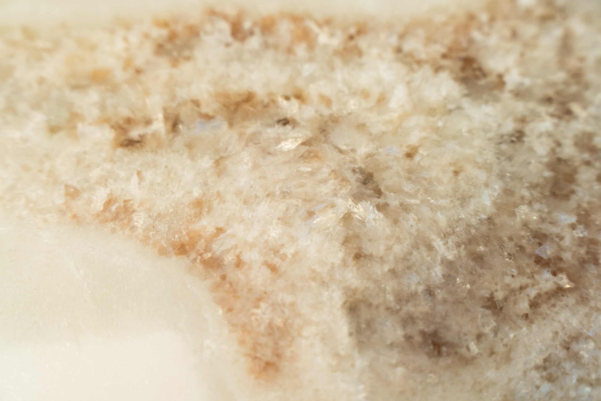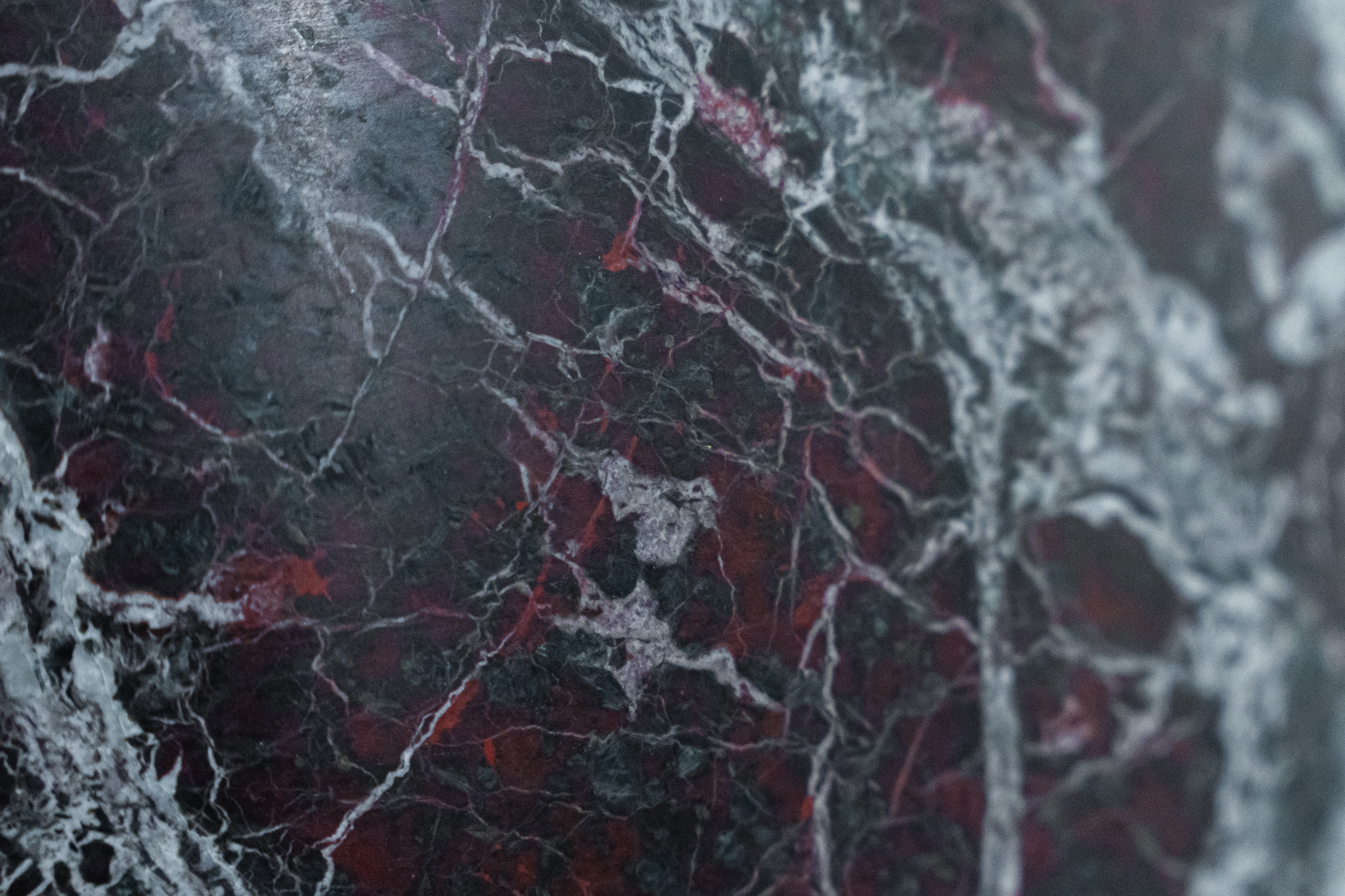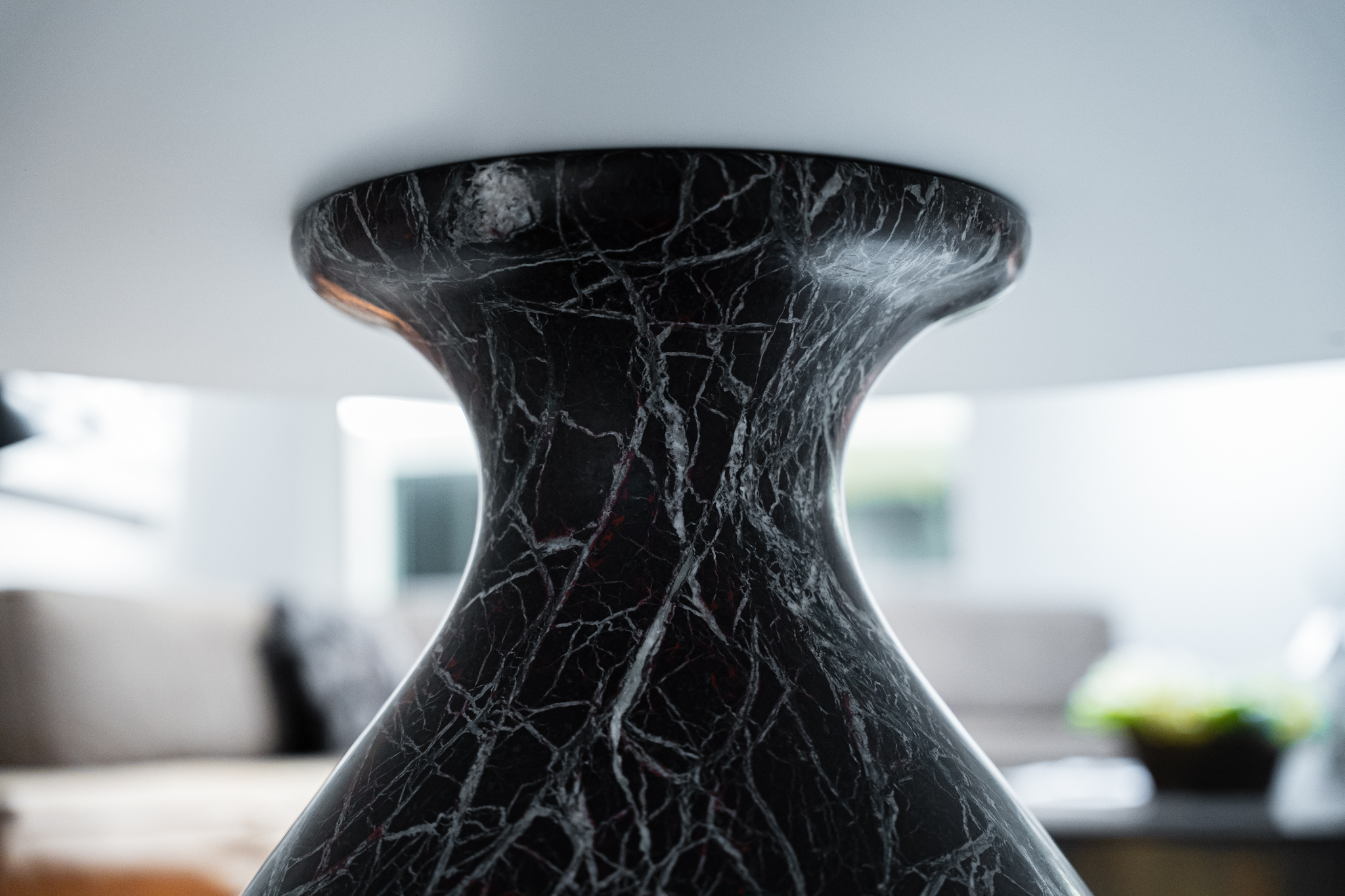 更具挑戰的是,基座並非單純直角,而是優雅的 沙漏弧度 。曲線收斂處尤為困難,需要經過反覆打磨,才能讓石材呈現柔順的線條與晶亮的表面。這是一場將堅硬材質轉化為流動造型的工藝考驗。
