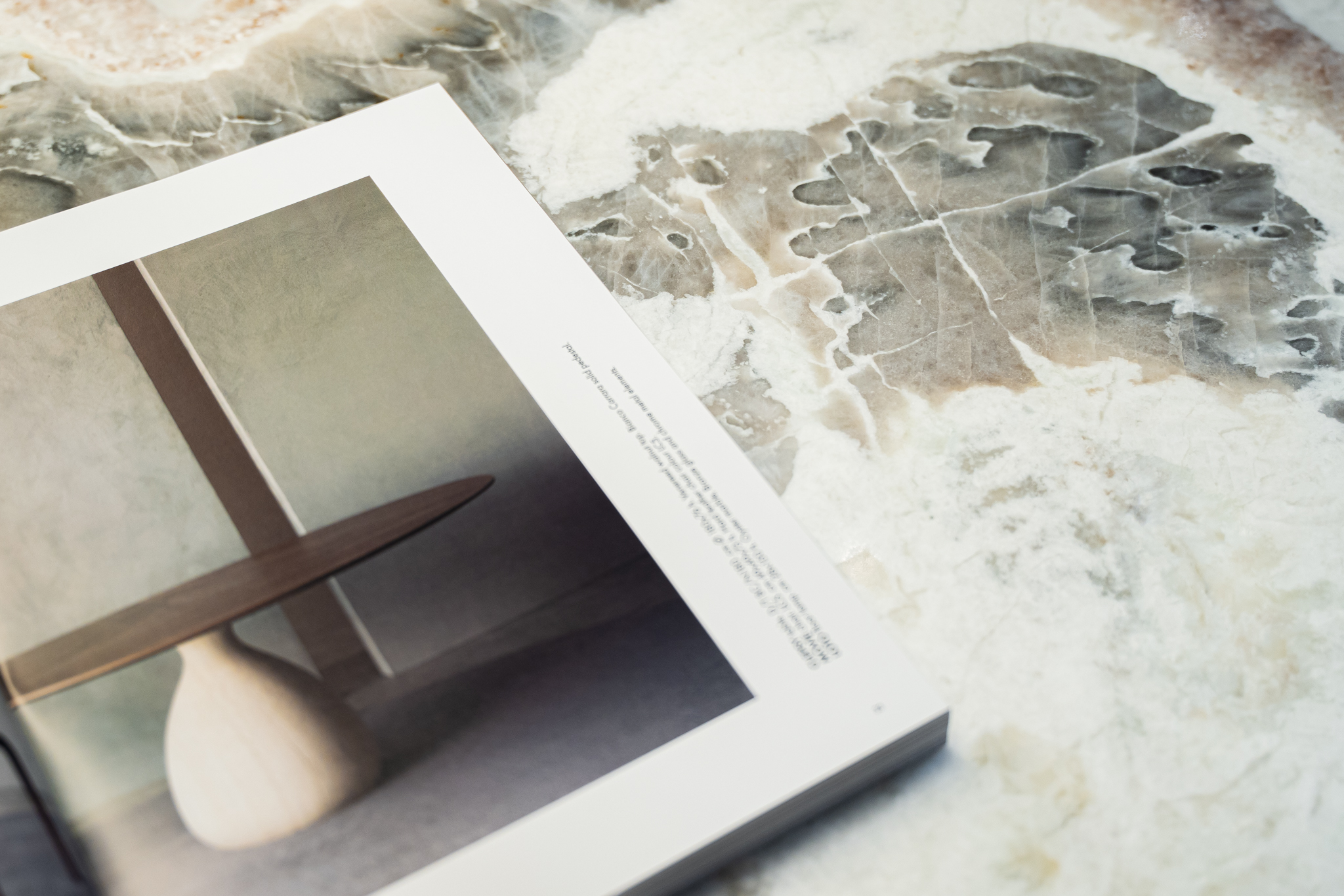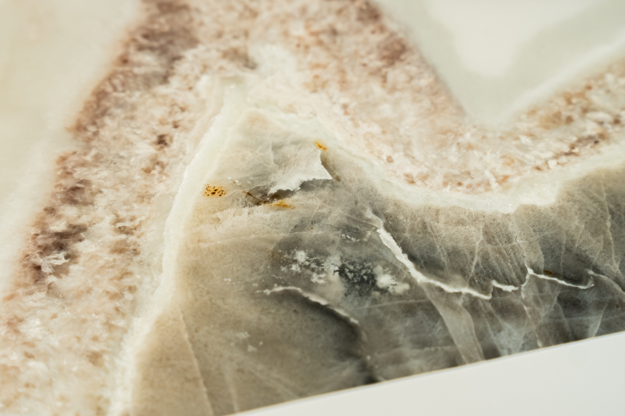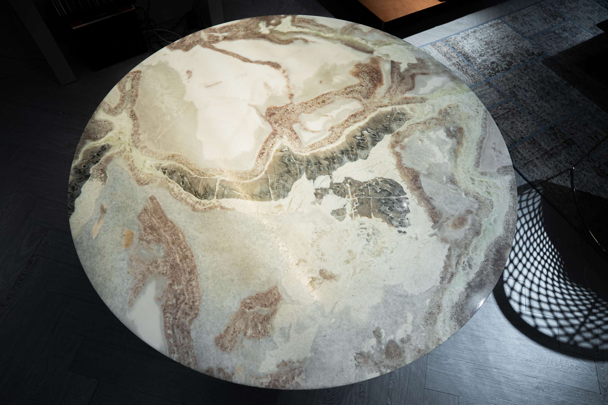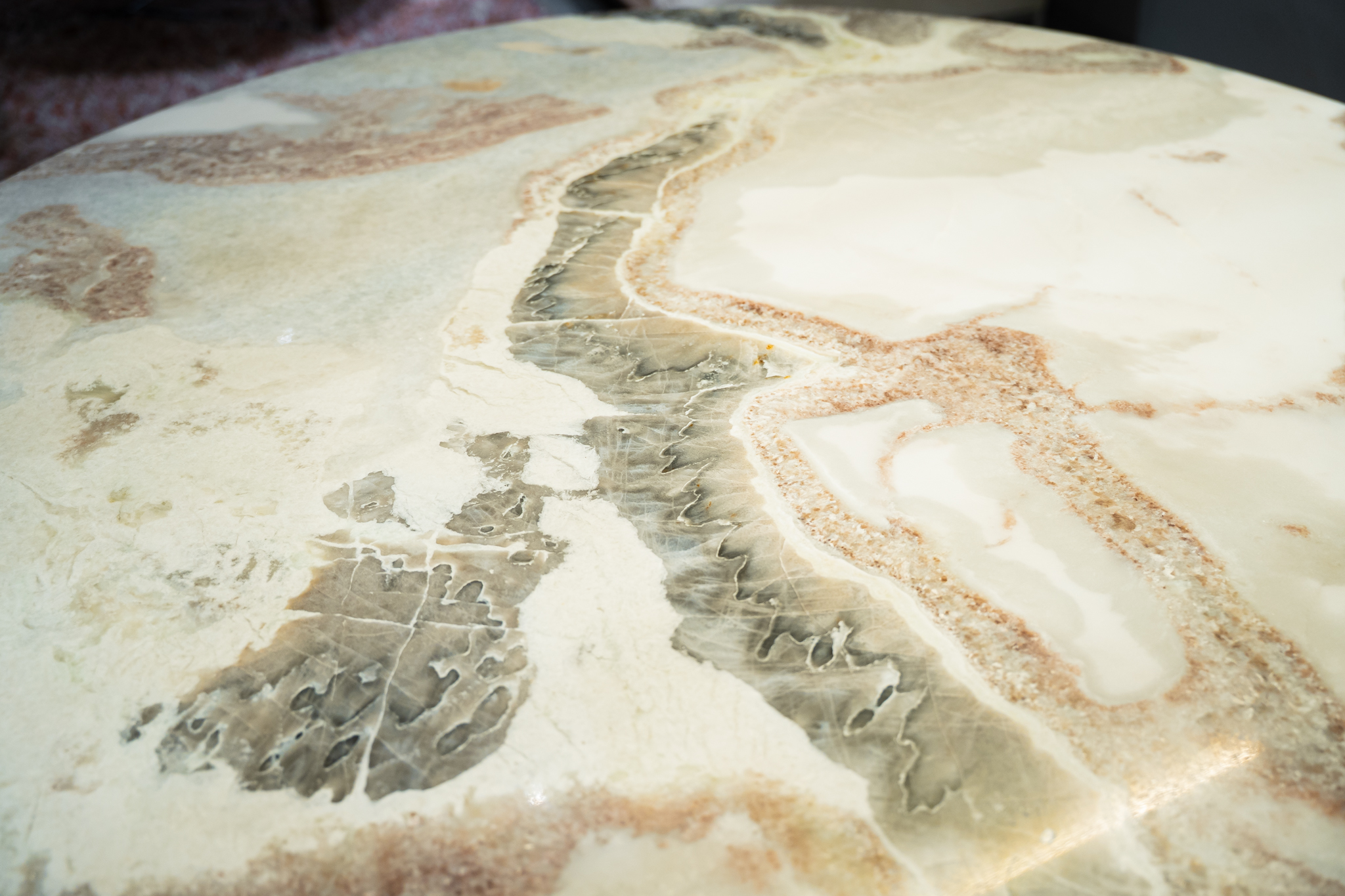 與紅色基座相呼應,桌面選用白玉石大理石(Bianco Onyx Marble),厚度達 3 公分。這樣的尺寸在天然石材中極為罕見,因為要確保大理石結晶的完整與穩定性,必須挑選極大且稀有的石材塊體。