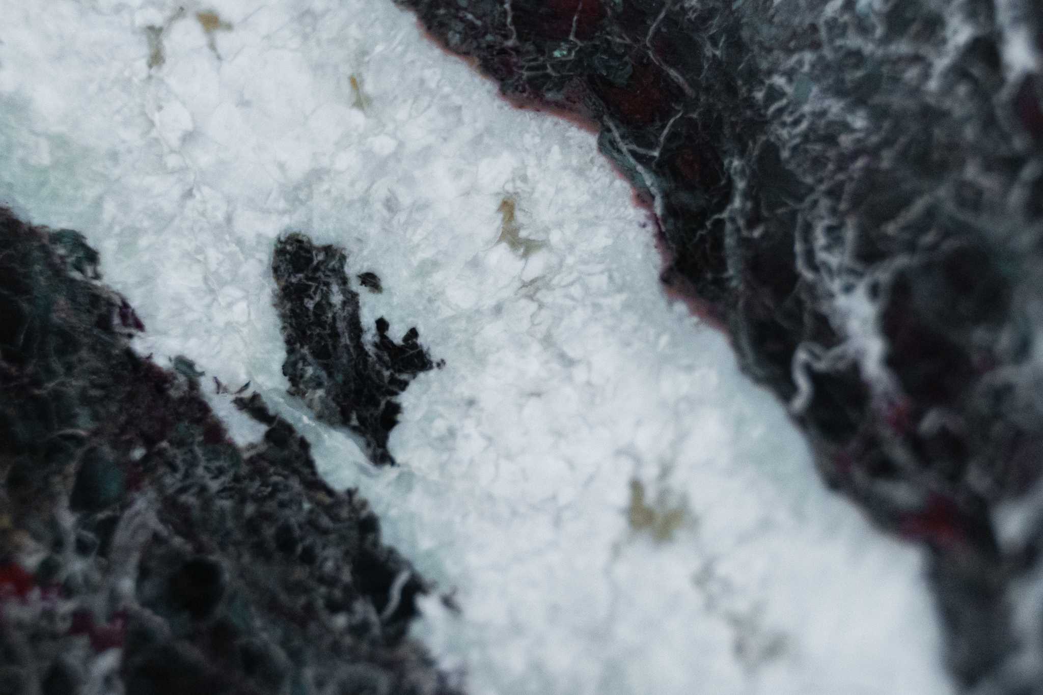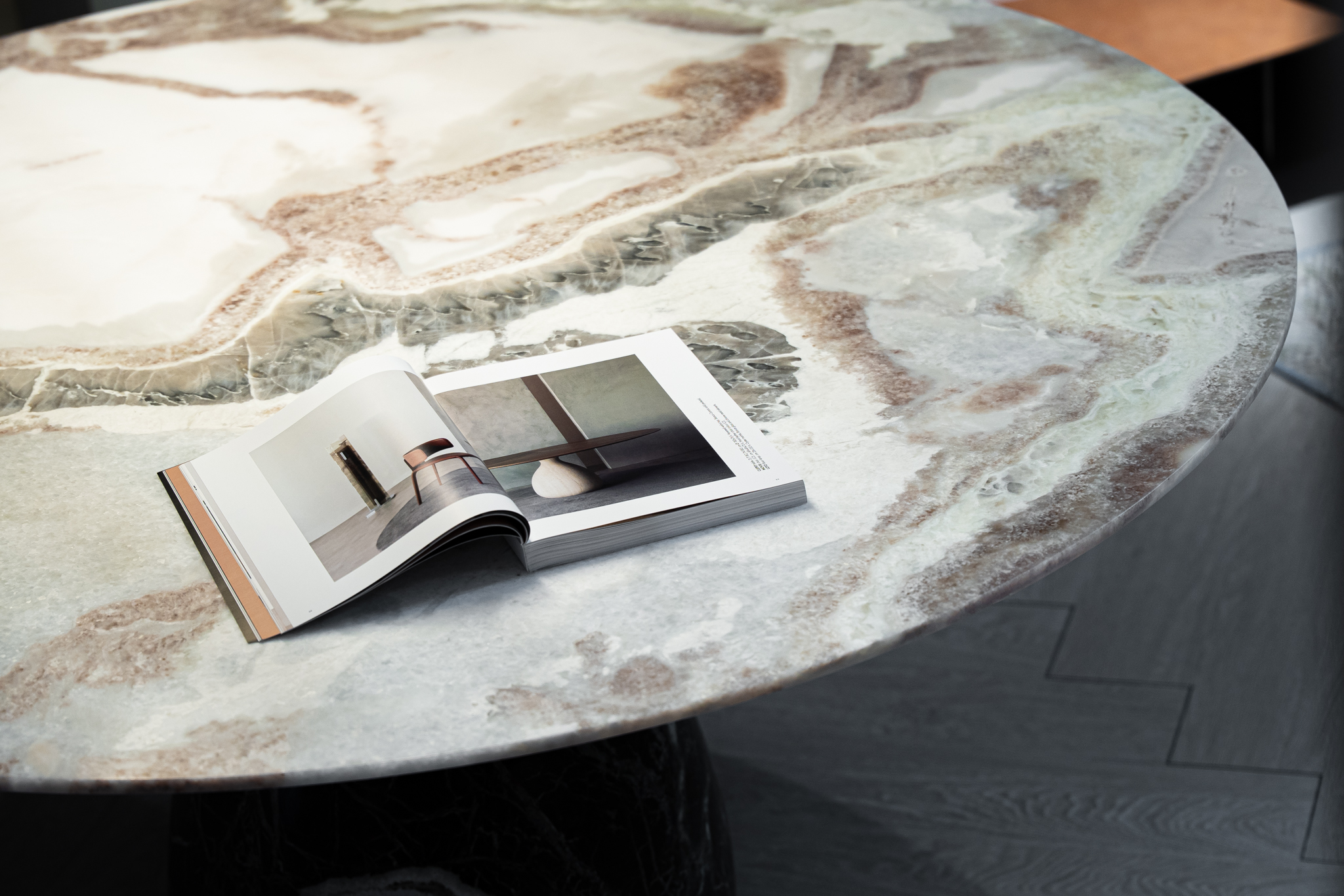 光線映照下,白玉石展現半透明質感,結晶紋理細膩而純粹,讓桌面宛如凝結時光的畫布。紅與白、厚與透,在 CLEPSY 上展現出獨一無二的張力。