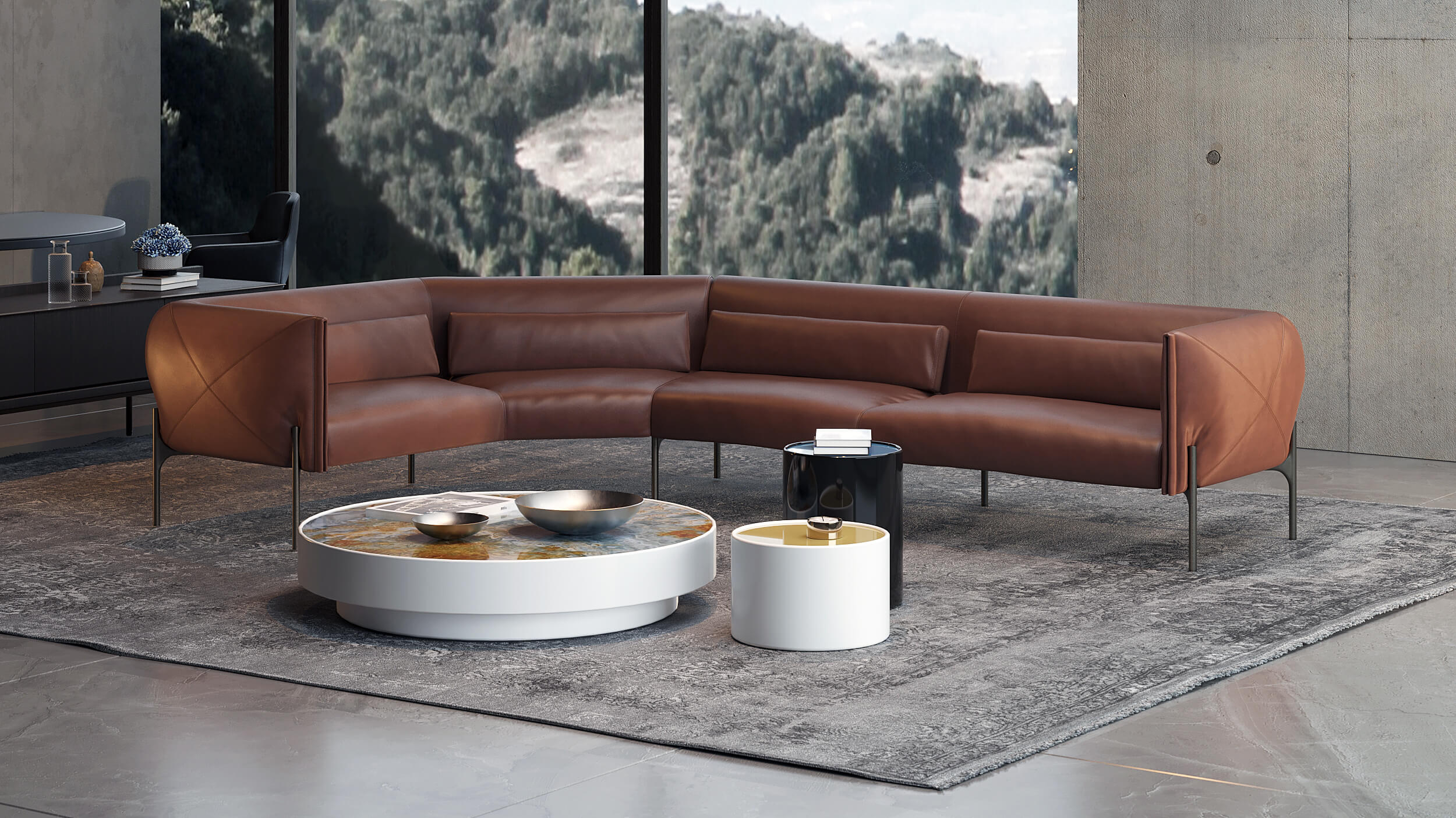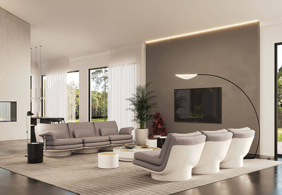 相較於大型座具,Compagna 扶手椅以更為內斂、緊湊的比例,展現皮革在微型空間中的表現力。其低矮且厚實的底盤設計,確保了物理上的穩定。而 Modular 系統則將柔軟建築 (Soft Architecture) 概念推向極致。它不預設空間的使用方式,提供無視覺斷點的設計,讓沙發在空間中呈現出一種流動的張力。