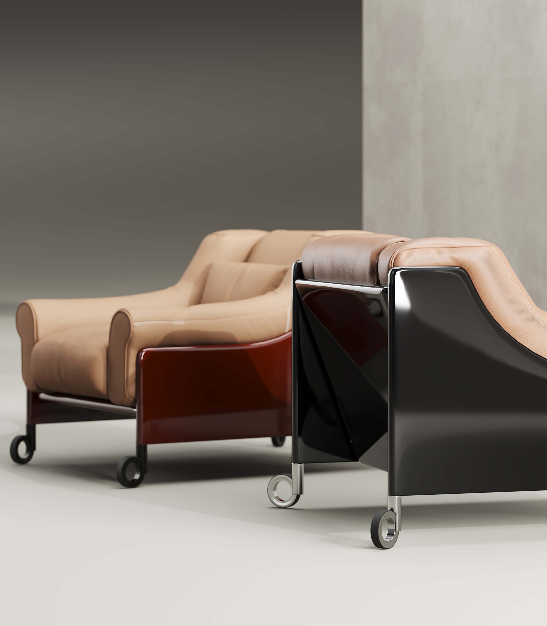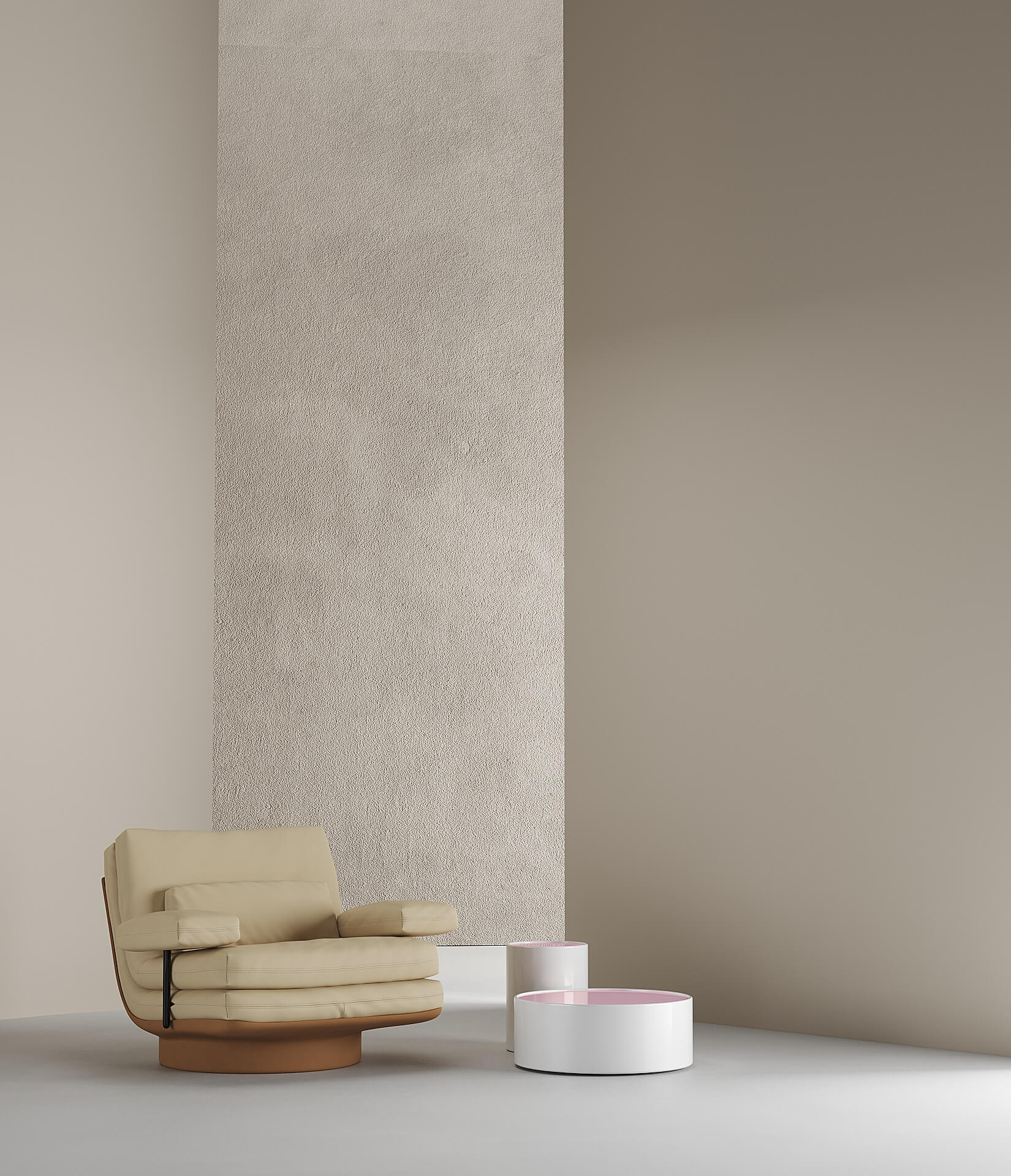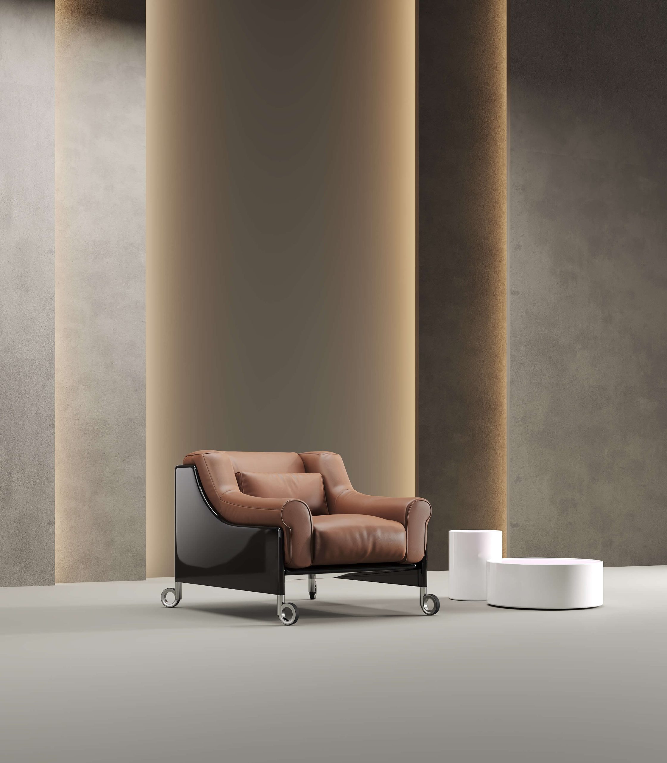 核心視覺由三層飽滿的圓環組成,每一層皮革都展現出向外擴張的張力。內部支撐結構被完全隱藏在厚實皮層下,使物件更趨向於一件 現代藝術家具收藏。隨著使用次數增加,圓環間的摩擦會使皮革產生更溫潤的光澤,賦予這張座椅隨歲月演進的層次感。