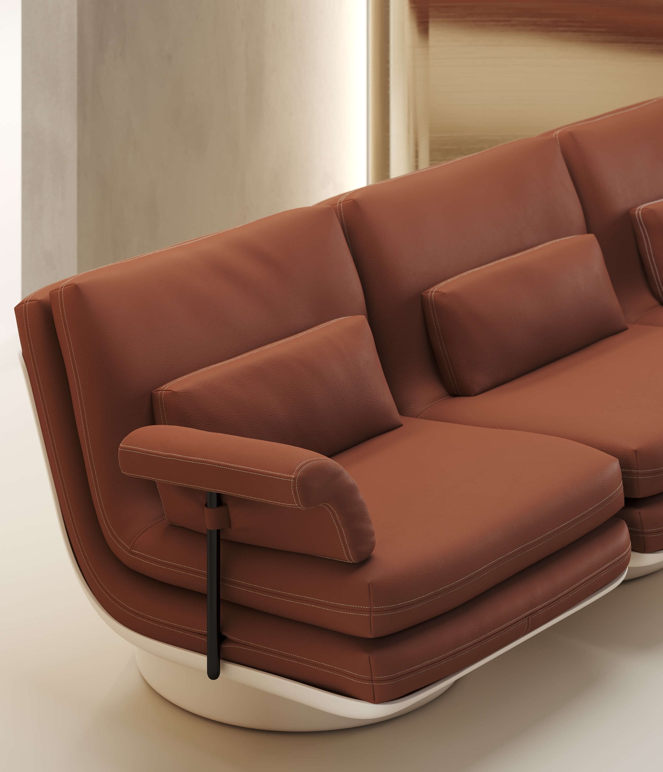 Rondo 最具辨識度的特徵在於那道環繞式的圓潤背靠。這道弧線藉由大量的厚實皮料裁片與高密度填充材料支撐,模擬出沙包受力後那種飽滿且紮實的視覺效果。每一吋皮料在接縫處產生的自然微褶,紀錄了 手工縫製皮革工藝 在物件上留下的物理印記。底座與座墊的低重心配置,確保了量體感沈穩,座墊內部的多層次結構則提供了由硬至軟的漸進式回饋。