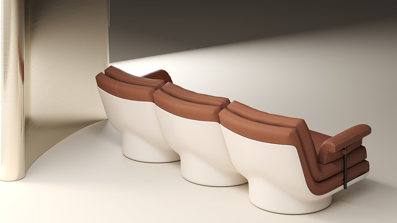 座背由一體成形的薄壁托付外殼包覆,材質為 可回收聚氨酯(recyclable polyurethane);外殼表面可選 高光烤漆 或同材質包覆 皮革 兩種呈現,讓觸感與反射各自成立,與皮革軟墊形成精準的對比。內部結構採 金屬骨架 搭配 高規格 坐靠用料,確保支撐與耐久。