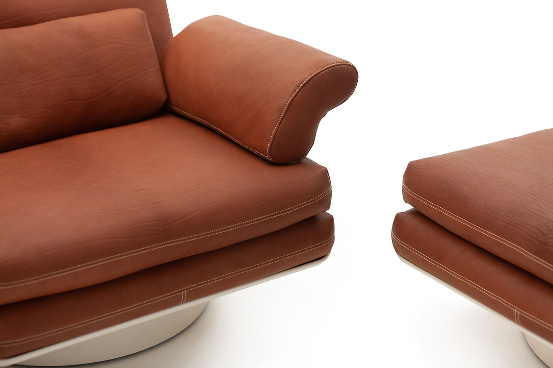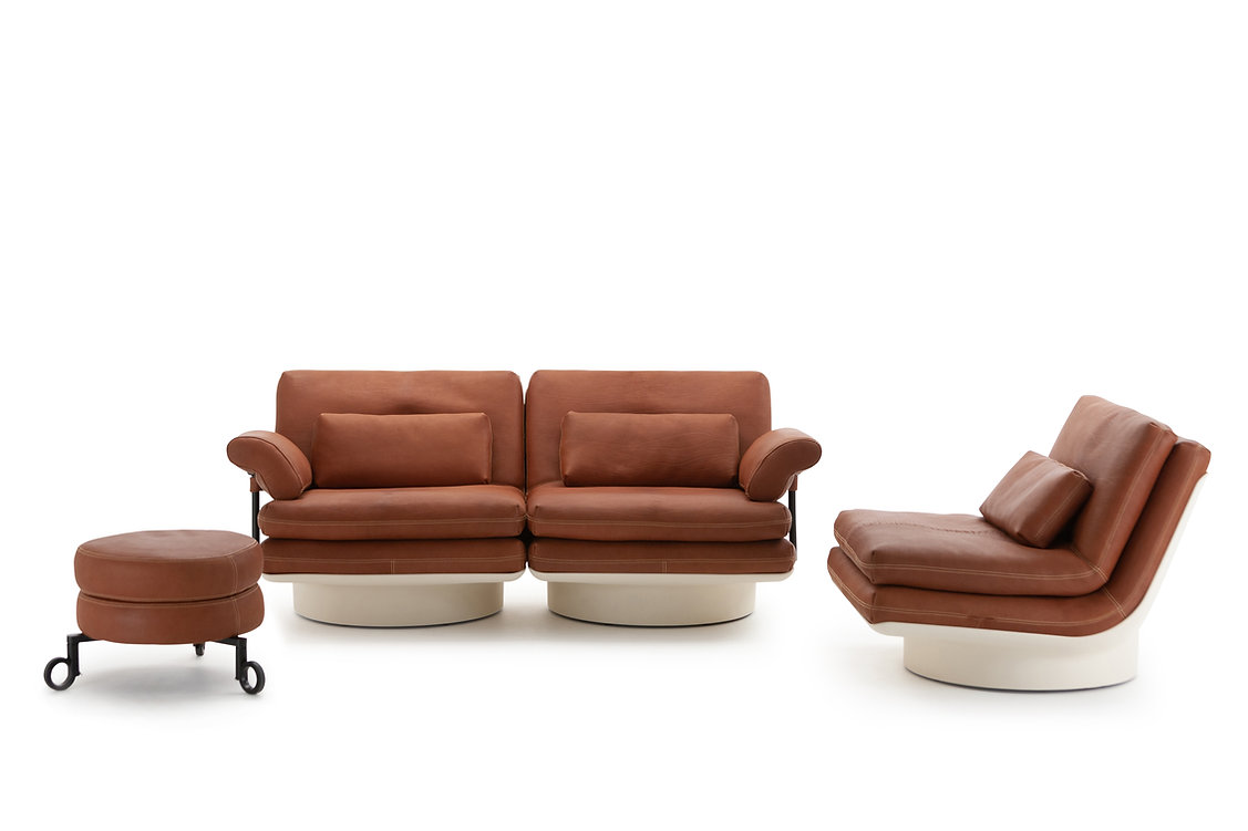 BIBENDUM 的視覺設計取材自 1960年代 的圓潤幾何,並以「可堆疊(stackability)」為核心構思:座墊與靠背像是將 牛皮皮革 軟墊堆疊而成,形成穩定、飽滿且具張力的量體,既有雕塑感,也帶出空間的整齊度。這組沙發延伸為 模組家具 的座系架構,能依家中大小調整配置與尺度。