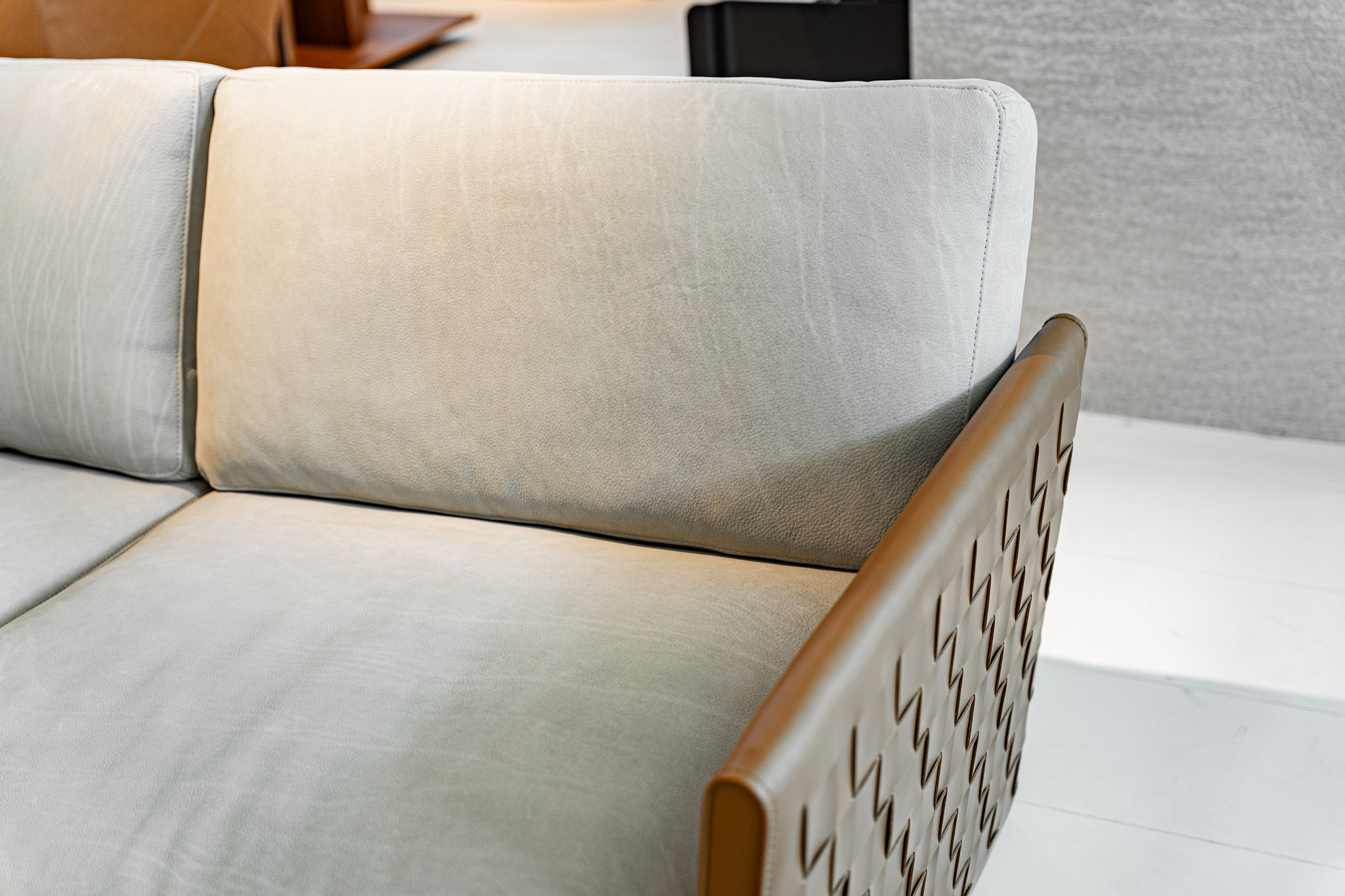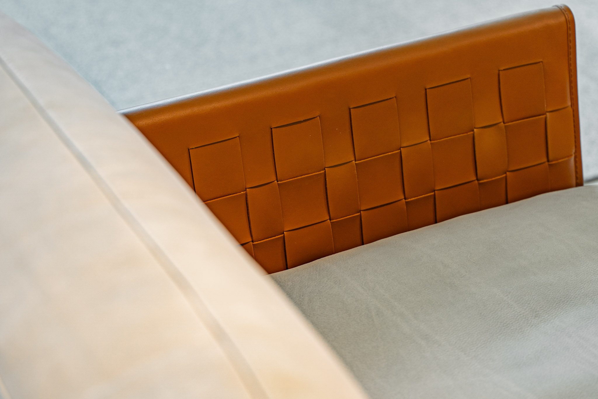 最大的亮點在於 Boogie 的扶手與椅背設計,選用來自托斯卡尼的寬幅皮革條,手工交織出一體成型的包覆感。每一個皮條皆經嚴格挑選與處理,保留皮革天然紋理與柔韌性,並配合結構線條順勢收邊,呈現無接縫般的編織感官。Boogie 提供模組化擴充,具備尺寸與結構靈活性,可依空間需求量身訂製,同時亦開放木質與金屬件材質搭配的自定義選項,實現高度個人化的奢華體驗。