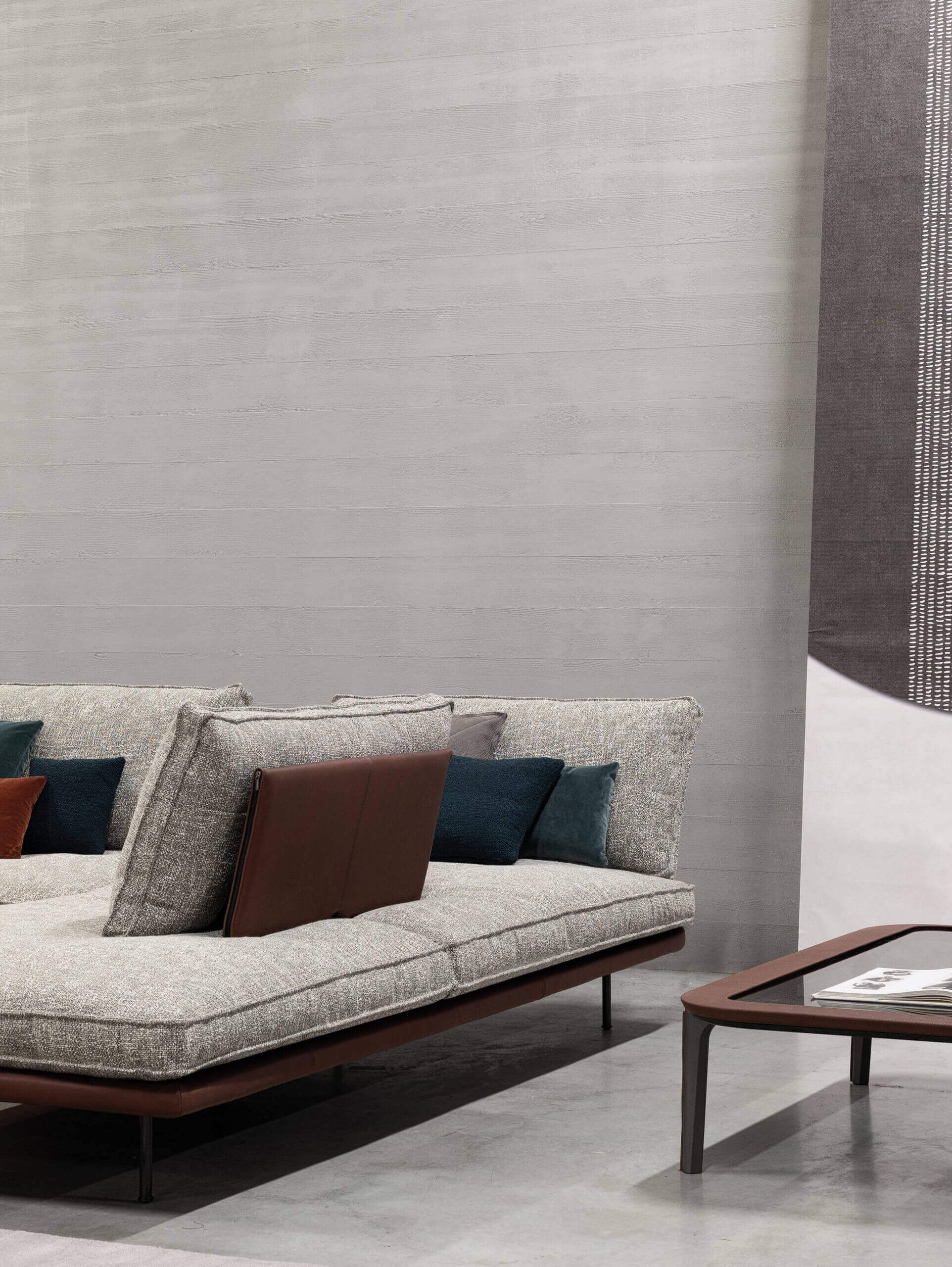 在靠背、扶手和座椅上重複著柔軟靠墊與簡潔線性結構之間的對比,這款產品玩轉面料的設計,混合了皮革和布藝,沙發結構為Setanil皮革,靠墊為Ipanema布藝。由於特殊的機制設計,靠背可以向後移動,以達到適合任何場合的理想座位位置並滿足所有需求。它的細腳確保了高度的舒適性,底座和支撐框架則採用皮革軟墊以形成對比,可以選擇布面座椅和靠背,或者完全由皮革製成。所有靠墊都可以根據需要訂製為皮革或布面,或兩者兼而有之。除了乾淨和現代的設計外,還提供了高度的舒適,這要歸功於靠背的兩種不同深度,為一款兼具經典與休閒的義大利進口沙發。